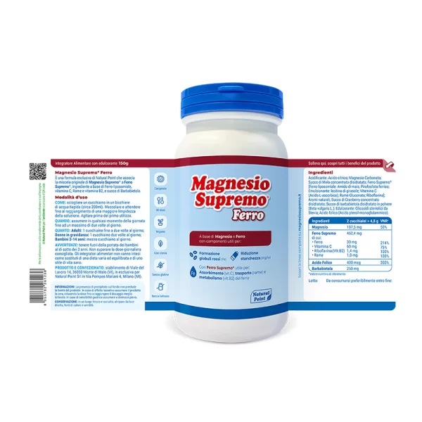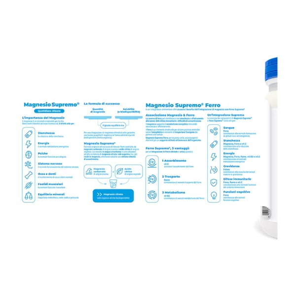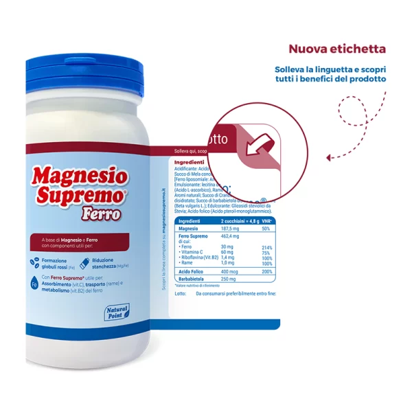 Magnesio Supremo Ferro è un integratore alimentare che associa i benefici di Magnesio Supremo® con Ferro Supremo® (ingrediente a base di ferro liposomiale, vitamina C, rame, vitamina B2), acido folico e succo di barbabietola. Magnesio Supremo Ferro è utile per:
