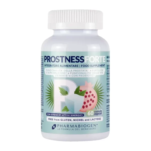 PHARMABIOGEN Prostness è un integratore alimentare a base di estratti vegetali con bromelina, zinco e probiotici. In particolare gli estratti di serenoa e ortica supportano la funzionalità della prostata, il drenaggio dei liquidi corporei e la funzionalità delle vie urinarie. I batteri probiotici favoriscono l’equilibrio della flora intestinale , mentre il melograno ha funzione antiossidante . Infine lo zinco contribuisce alla normale fertilità e alla normale riproduzione e al mantenimento di normali livelli di testosterone nel sangue.