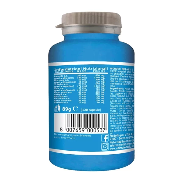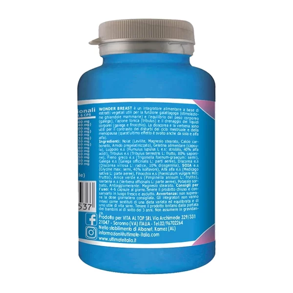 Ultimate Italia Wonder Breast è un integratore alimentare a base di estratti vegetali utili per la funzione galattagoga (stimolazione ghiandole mammarie) e l’equilibrio del peso corporeo (galega), l’azione tonica (tribulus) e il drenaggio dei liquidi corporei (galega e finocchio). La dioscorea e la verbena sono utili per il contrasto dei disturbi del ciclo mestruale e della menopausa (quest’ultimo effetto è svolto anche da soia e alfa alfa).